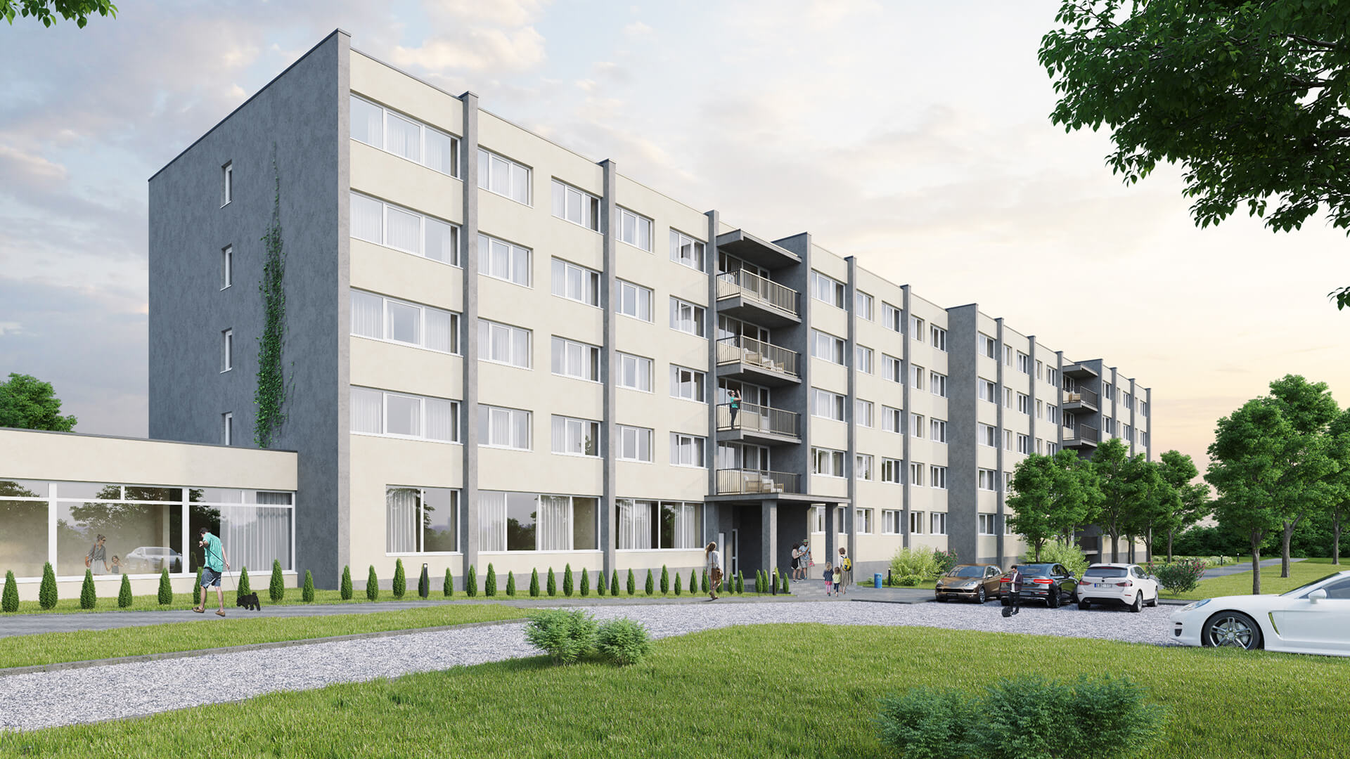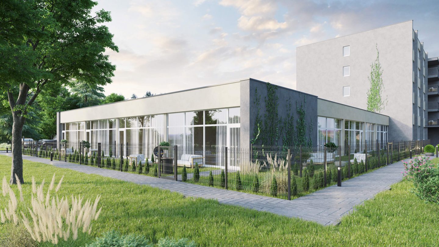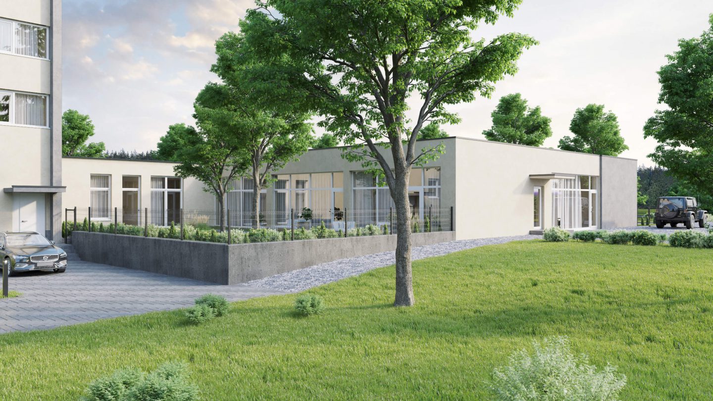 - Sutvarkomas gerbūvis aplink pastatą (įrengiamas nuogrindos prie pastato, lauko šviestuvai, atsėjama žolė)